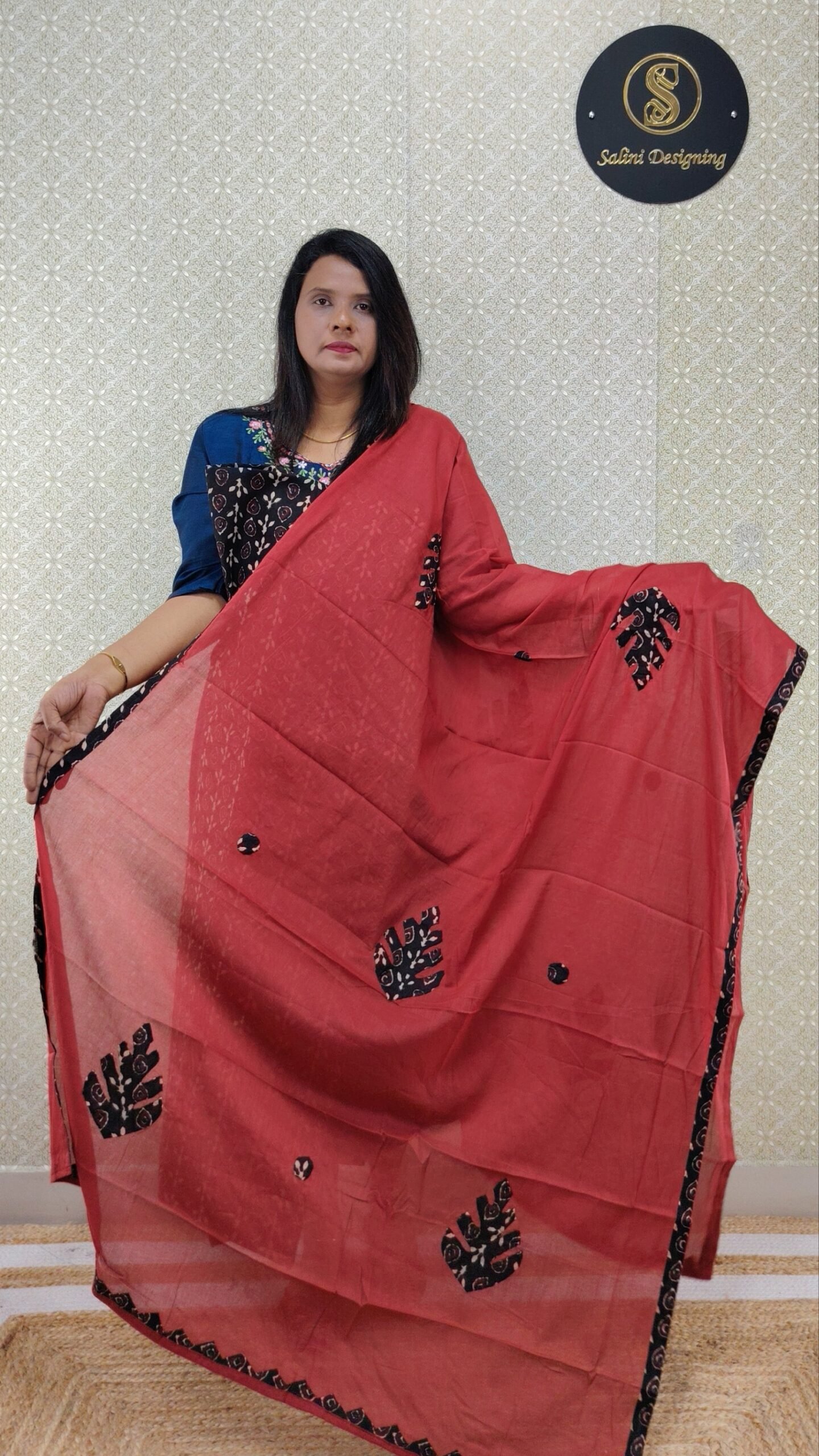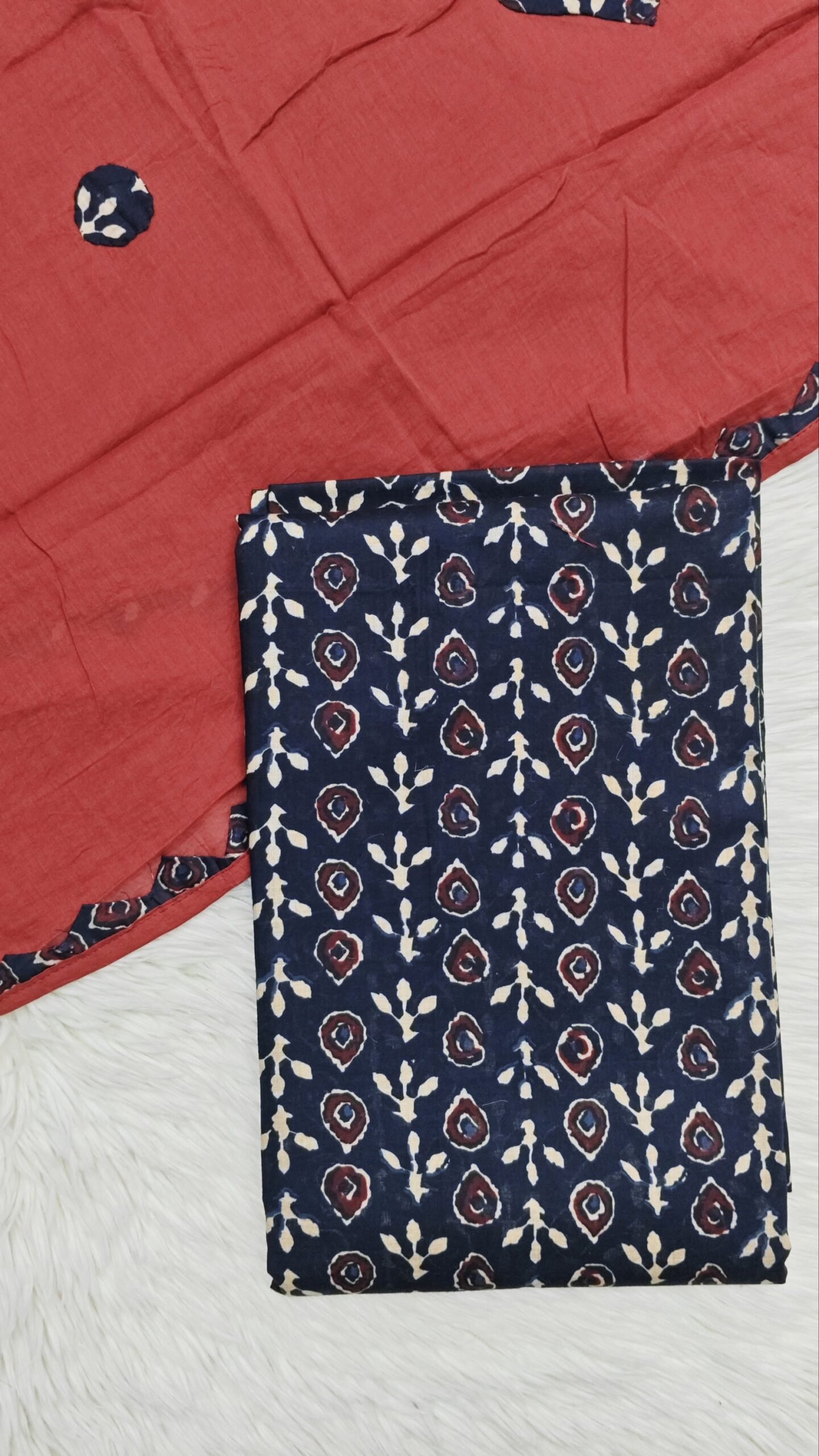 Unstiched Salwar material Color: Blue and Maroon Fabric- Cotton Top: 2.5 mtr Applique work Dupatta: 2.5 mtr Bottom: 2 mtr Bottom Fabric- Cotton material