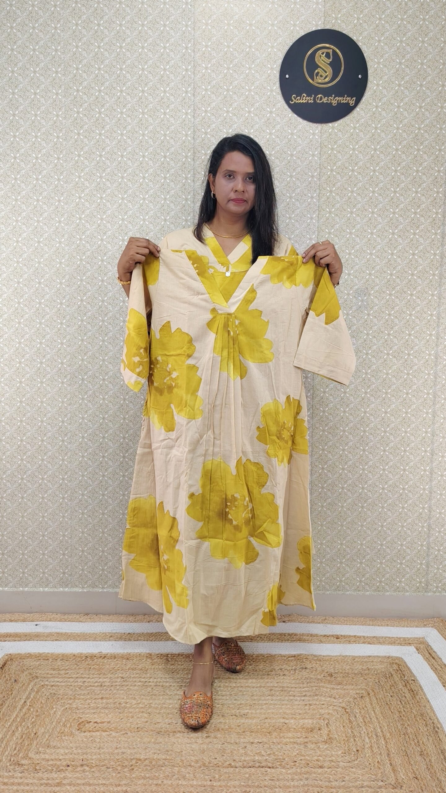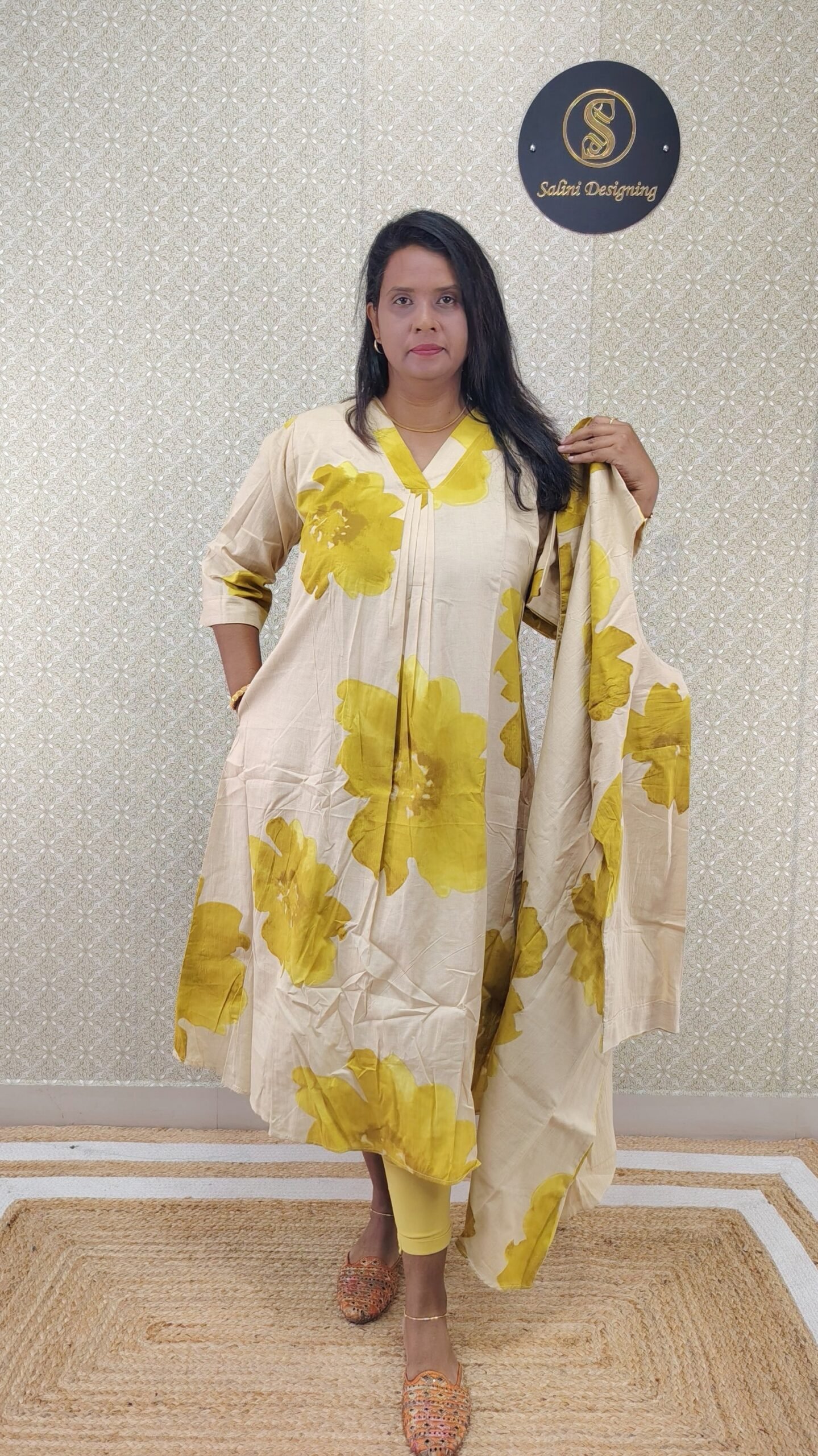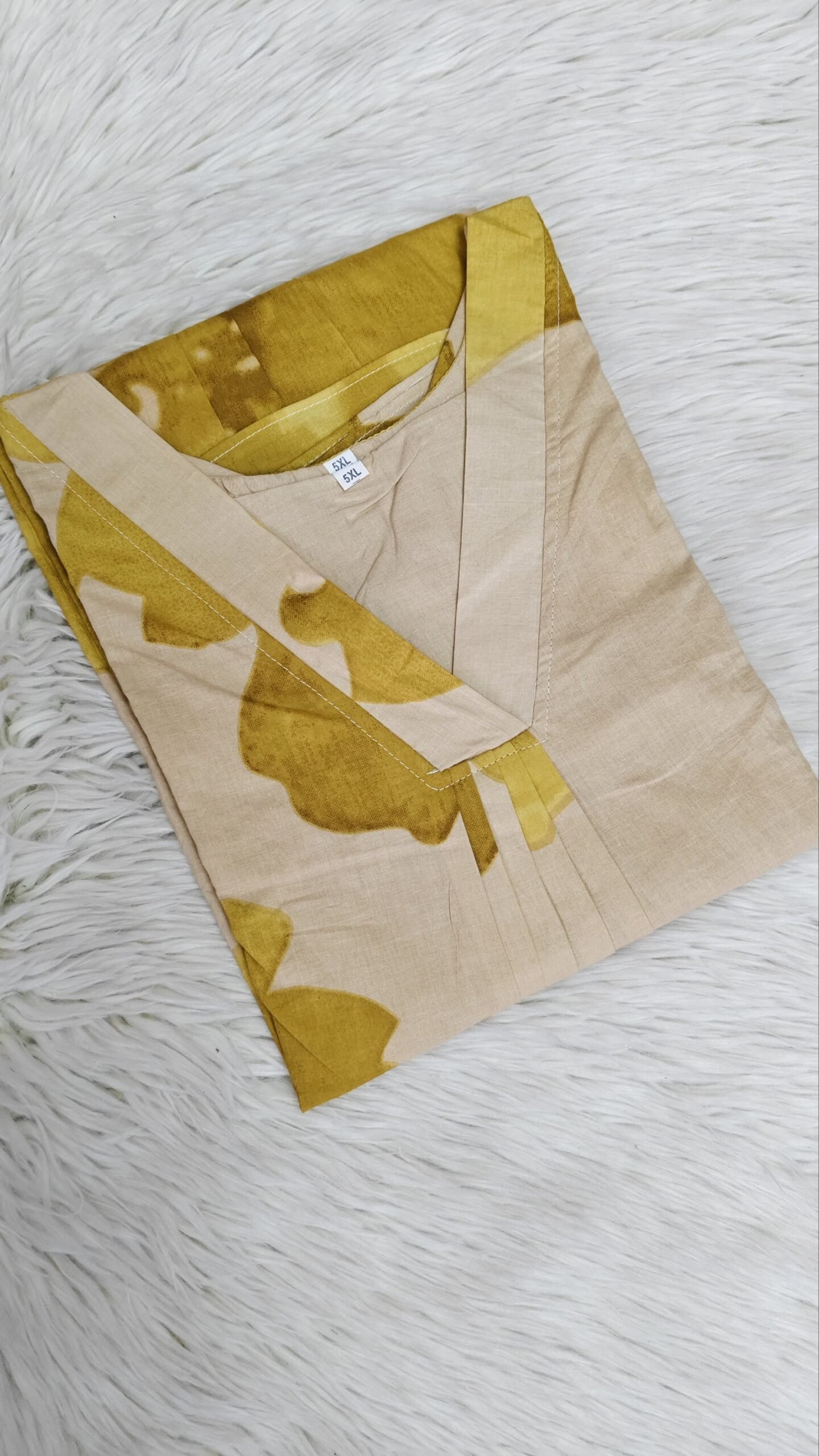 Fabric Cotton Front Portion- Pleated With lining 3/4 Sleeves without Lining Length– 46 V neck A Line Cut Kurti