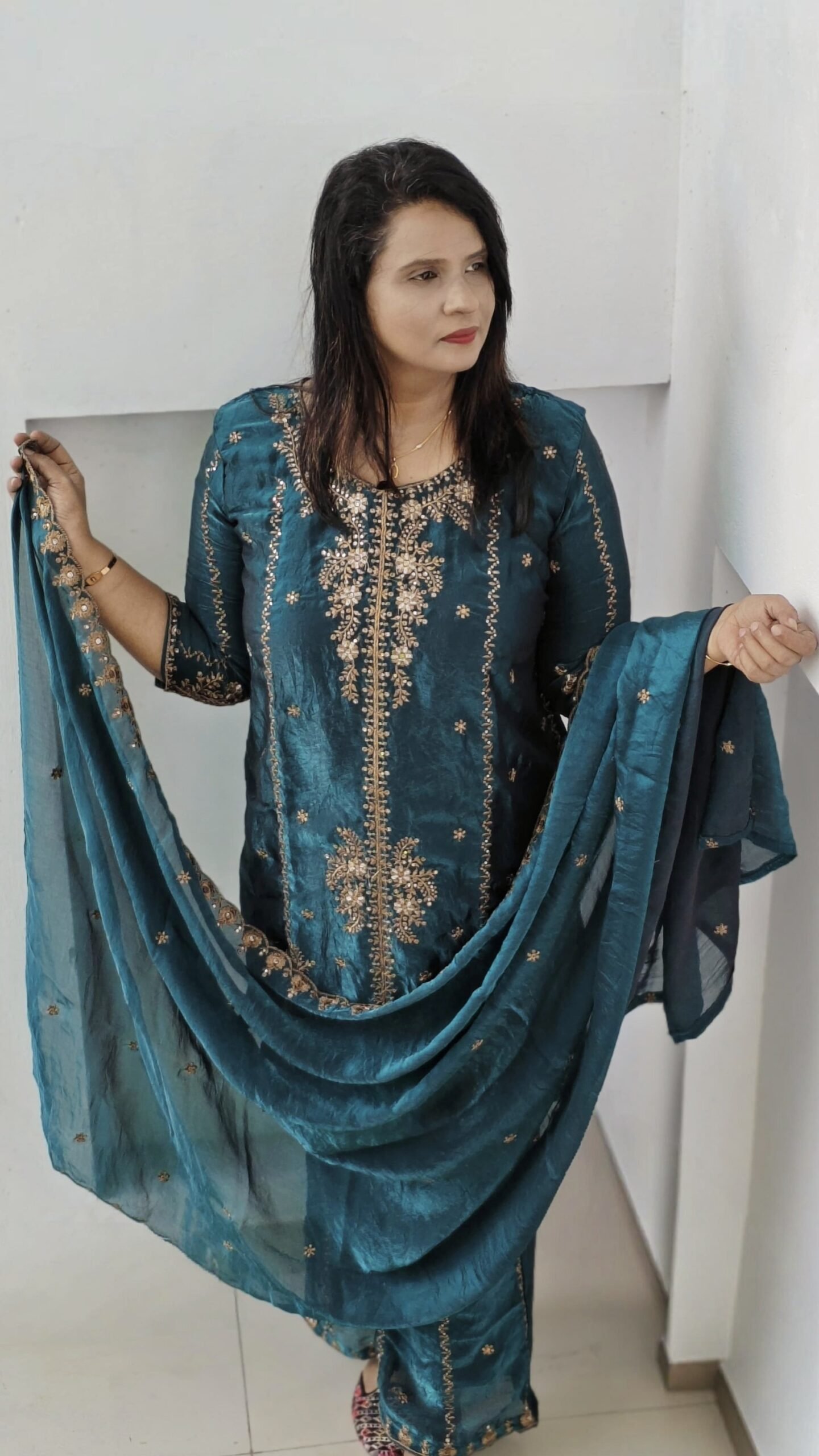 Fabric- Fendi 3 Piece set With Lining Length- 37 3/4 Sleeves with Lining Peacock Blue Heavy work Top, Dupatta and Flared Bottom
